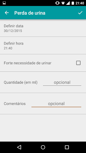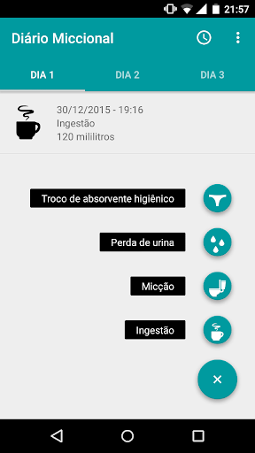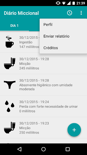 Com este diário, você poderá registrar suas ingestões diárias de líquido, micções, perdas de urina e trocos de absorvente higiênico durante três dias. Após ter finalizado os registros dos três dias, poderá enviar um relatório por correio eletrônico ao seu doutor.