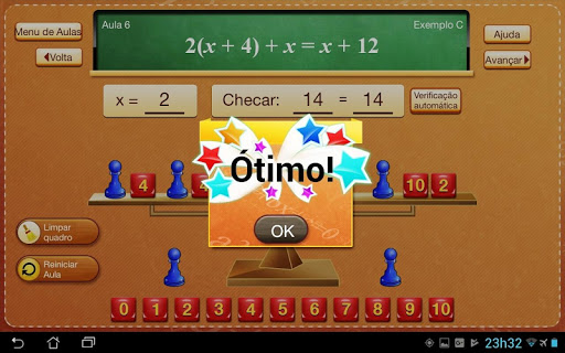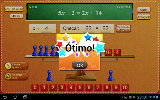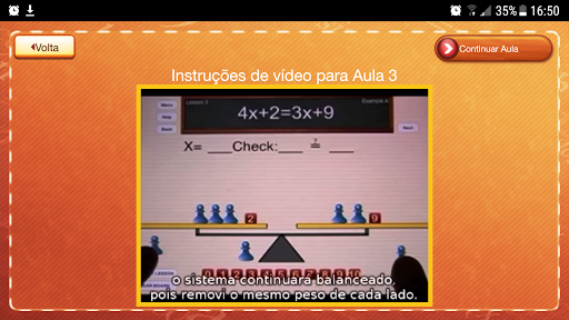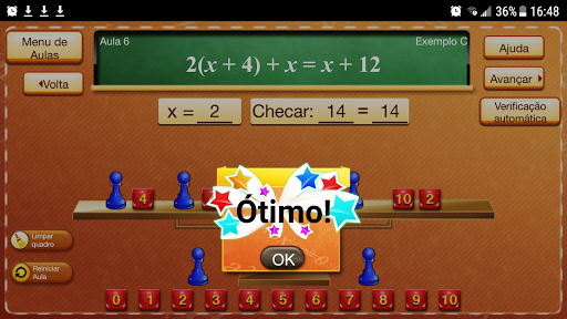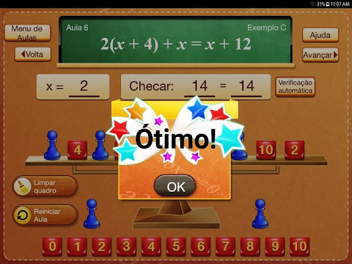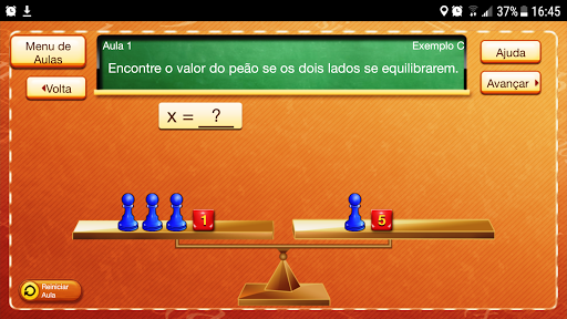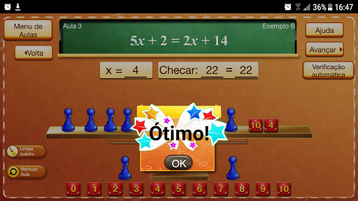Na Aula 2, o aluno coloca as peças do jogo na imagem da balança para representar ambos os lados da equação abstrata.