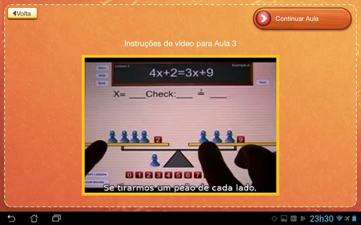 Nas Lições 3 a 6, o aluno coloca as peças do jogo na imagem da escala de equilíbrio para representar os dois lados da equação algébrica e depois usa "lances legais" para simplificar fisicamente a equação.