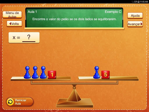 O desconhecido, x, é representado por um peão azul. As constantes numéricas, por número de cubos. Cada lição se concentra em um conceito-chave.