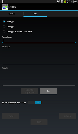 5. texto criptografado será apresentado sob a etiqueta de Resultado. Você pode enviar o resultado com o acessório opcional ( o arquivo anexado será criptografada também) , enviá-lo por SMS ou simplesmente copiá-lo para o clipboard .