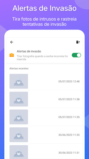 - Tira fotos de intrusos e rastreia tentativas de invasão;