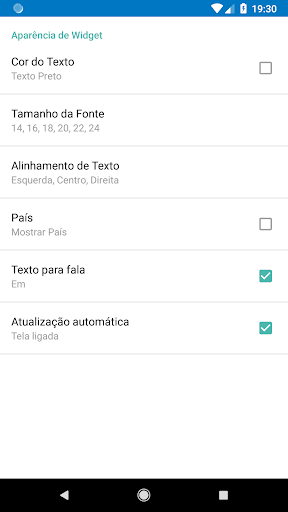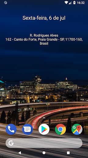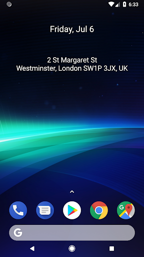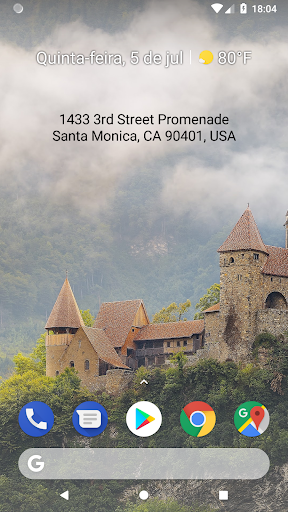 Personalize a cor, o tamanho e o alinhamento da fonte, dependendo do papel de parede e do país. Toque no widget para atualizar seu endereço atual. O Widget não é atualizado automaticamente para preservar a bateria. Mas, ele será atualizado uma vez a cada vez que a tela é ligada. Requer serviço de localização e permissão.