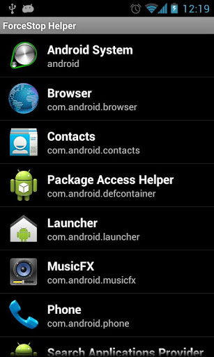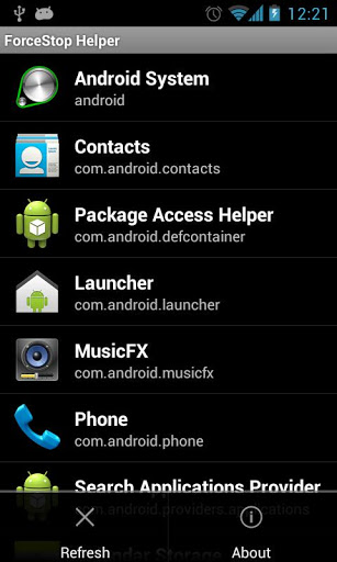 A simple app that lists all the apps that can be Force Stopped . Selecting an app from the list launches its corresponding Settings AppInfo Details activity where the 'Force stop' button is enabled. Press Menu -> Refresh to check again.