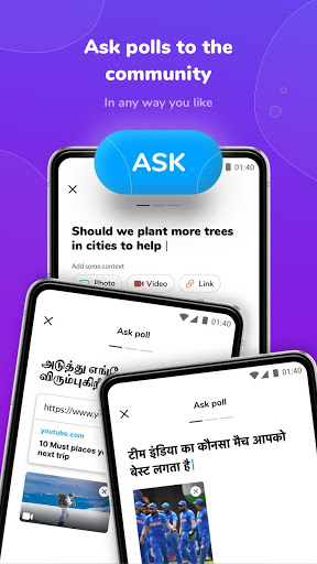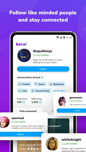 O aplicativo Koral Poll é uma comunidade de indianos que se uniram para ajudar uns aos outros com suas perguntas, e opiniões em sua língua preferida - Inglês, Hindi, Bengali, Oriya, Malayalam, Tamil, Telugu, Kannada, Gujarati e Marathi - Via pesquisas rápidas e discussões