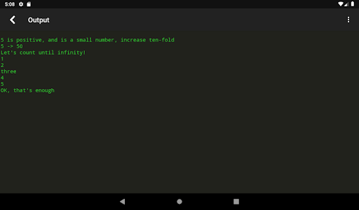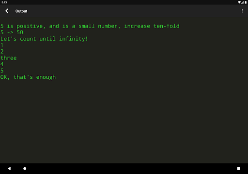 - tempo máximo de funcionamento é 20 Funções de arquivo, rede e gráficos podem ser limitadas - este é um compilador de lote; Programas interativos não são suportados. Se o seu programa for for um prompt de entrada, insira a entrada na guia Entrada antes da compilação. Veja a guia Referência no aplicativo para exemplos de código.