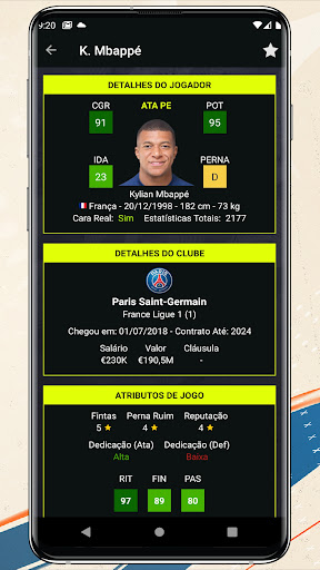 Na tela Detalhes jogador, você é capaz de exibir dados altamente detalhados e Foto do Jogador, Nome Completo, as Posições Preferidas, Data de Nascimento, Altura, Peso, Data de Vencimento do Contrato, Salário, Valor, Escape Clause, Especialidades, Traços, Perna Ruim, Fintas, Dedicação, Classificação dos jogadores por posições.