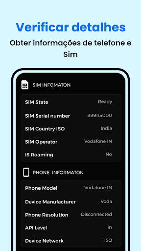 Obtenha informações do dispositivo e do SIM, como número do SIM, nome da operadora do SIM, nome do modelo, número IMEI, versão do Android, nível da API, informações e marca do hardware, resolução do telefone e nível da API.