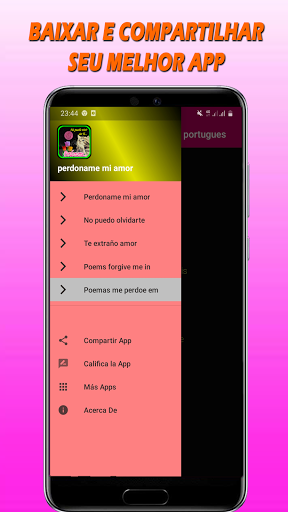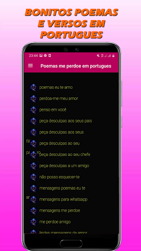 Seu novo e exclusivo app Perdoe meu amor chegou para compartilhar em sua rede favorita, com os melhores poemas de amor, poemas e versos para fazer uma mulher se apaixonar, poemas para fazer um homem se apaixonar por uma seleção dos mais belos poemas e versos de amor e romântico, para que possa partilhar em todas as suas redes sociais, com as pessoas que mais ama, os seus amigos, familiares ou o amor da sua vida através das suas redes sociais preferidas. Você está procurando inspiração para sua carta de amor? Você vai mandar uma mensagem para quem você ama? Bem, se sim, este aplicativo de poemas de amor é para você. Poemas de amor sua melhor aplicação com poemas curtos de amor e amizade você só encontrará poemas que realmente te apaixonem e roubem um suspiro de quem os recebe, não hesite em dar um poema ou os mais bonitos e românticos versos de amor, para fazer aquele menino ou menino se apaixonar que você tem um amor louco, então o amor da sua vida estará sempre ao seu lado. Você não sabe como começar a se apaixonar, não se preocupe por você, nós selecionamos as melhores frases para o amor, a amizade ou para a sua vida, temos certeza que você poderá se apaixonar pelo amor da sua vida e roubar um sorriso dele todos os dias.