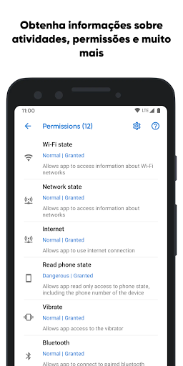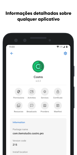 Descubra como qualquer app funciona por dentro. A lista de atividades, serviços, permissões usadas e até detalhes do certificado e assinatura está ao seu alcance.
