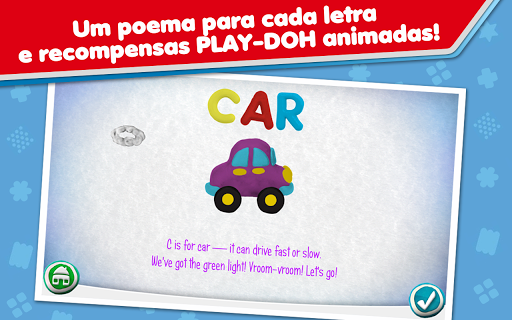 Aprende as letras do alfabeto com a plasticina PLAY-DOH virtual. Que palavra começa por C? Crocodilo! Cuidado, ainda te trinca os dedinhos! Por cada resposta correta, receberás uma recompensa virtual de plasticina que podes transformar no que te apetecer. Queres experimentar outra cor? Não há problema! Estás com vontade de esmagar a tua última criação? Também o podes fazer!