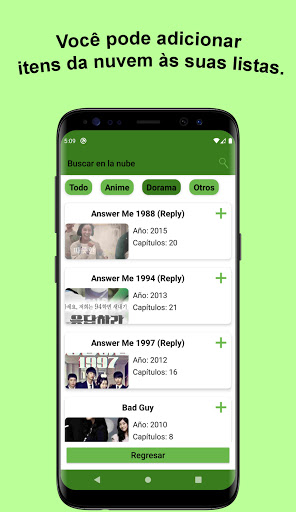 - Pontuação pessoal: Você pode selecionar uma pontuação pessoal para cada item, ver detalhes extras como o ano de lançamento e número de capítulos. Além disso, você pode controlar quantos capítulos viu em cada item.