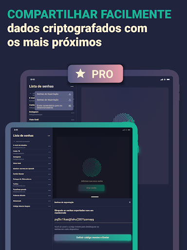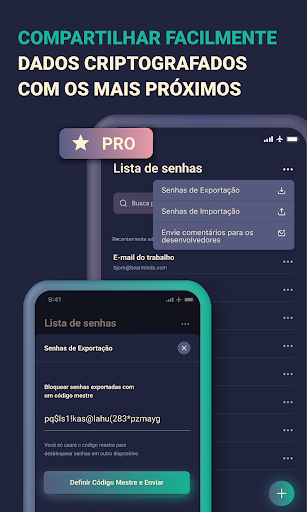 • Cofre seguro: Armazenamento criptografado no seu telefone usando o algoritmo RSA-2048 bits