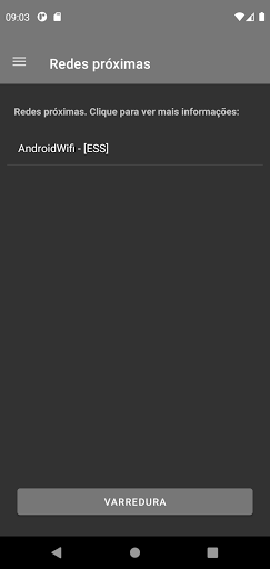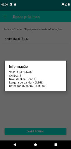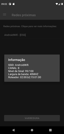 Na tela principal é possível verificar todas as redes sem fio ao seu redor, ao clicar em uma rede será exibida informações básicas como o nome, a segurança, roteador, largura de rede e a força do sinal até seu dispositivo.