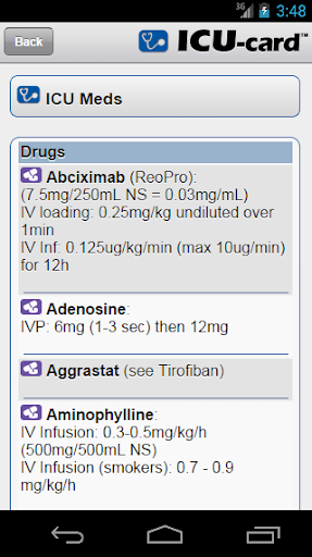 O aplicativo ICU-Card ™ inclui drogas, dosagens, fórmulas, equações e valores normais para hemodinâmica, pulmonar, renal, nutrição, etc.