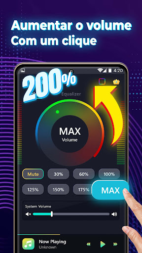 O som pode ser aumentado em até 200% da música, alto-falantes, gravações, áudio do vídeo,... e todos os sons do seu dispositivo. O volume do alto-falante suporta aumento de volume para fones de ouvido, Bluetooth e alto-falantes.