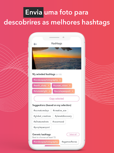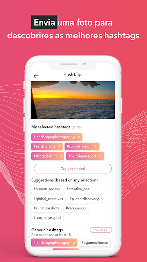 ✔ Envia uma foto para receber propostas de hashtags. Todas as hashtags são geradas automaticamente e especificamente para a tua foto.