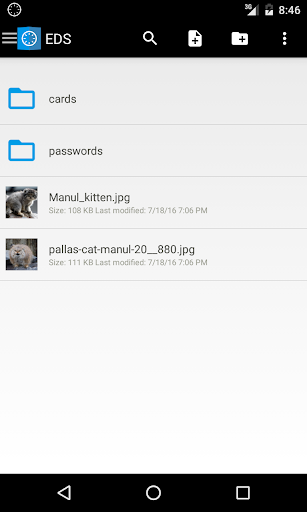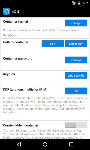 EDS (armazenamento de dados criptografados) é um software de criptografia de disco virtual para Android, que permite armazenar seus arquivos em um contêiner criptografado. Veracrypt (R), TrueCrypt (R), Luks, Encfs, CyberSafe (R) Os tipos de contêineres são suportados.