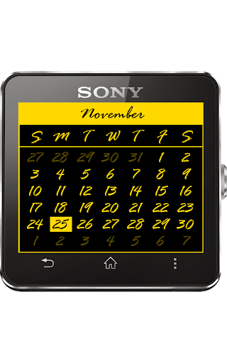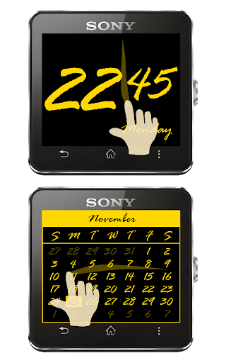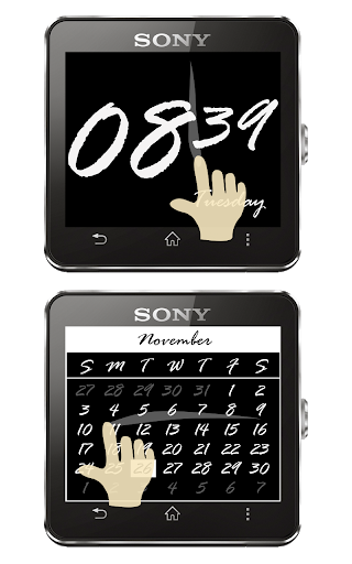 Este é um bonito e luxuoso Relógio para o seu SmartWatch 2, mas também é um Calendário. Desfrute desta solução 2-em-1 de forma elegante. Deslize o dedo verticalmente no ecrã para trocar do Relógio para o Calendário, deslize horizontalmente para navegar pelos meses do calendário, deslize verticalmente outra vez e estará de volta ao Relógio.