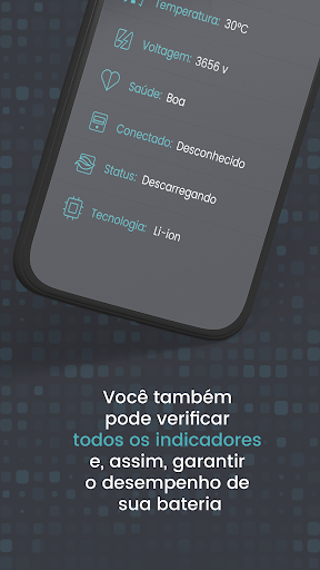 O aplicativo mostra informações completas sobre a bateria: indicador de temperatura, tensão, indicador de carga e capacidade da bateria.
