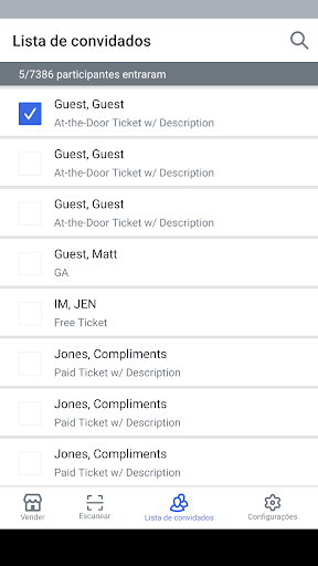 Faça check-in de convidados escaneando códigos de barra/QR dos bilhetes ou procure compradores pelo nome.