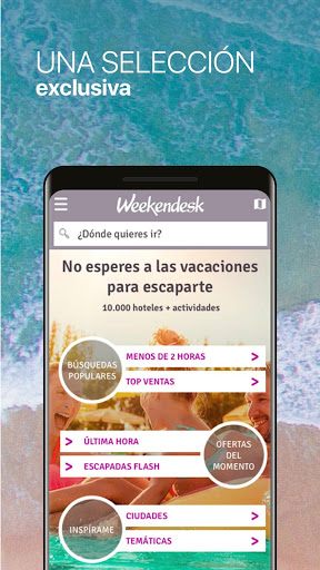 La aplicación de Weekendesk será tu gran aliada para encontrar escapadas perfectas. ¡Una selección de escapadas exclusivas y de calidad al mejor precio con más de 10.000 hoteles y actividades en España y Europa!