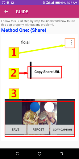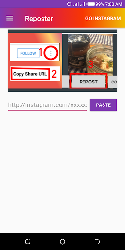 Você também pode copiar hashtags ou texto de legenda facilmente para publicá-lo em seu feed ou status pessoal do instagram. Você pode repassar vídeos e fotos do instagram com facilidade