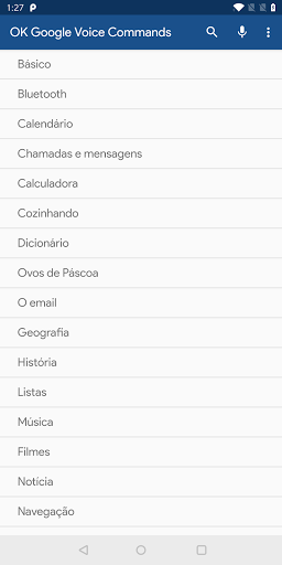 As categorias de comandos são: Comandos offline, O básico, Pesquisa, Navegação, Entretenimento e muito mais.