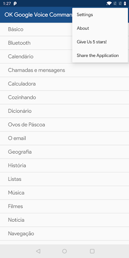 Este aplicativo fornece uma lista completa de comandos de voz para alto-falantes inteligentes do Google Assistente e Google Home que são ativados por uma frase especial Ok Google ou Ei Google. Todos os comandos de voz são categorizados.