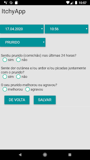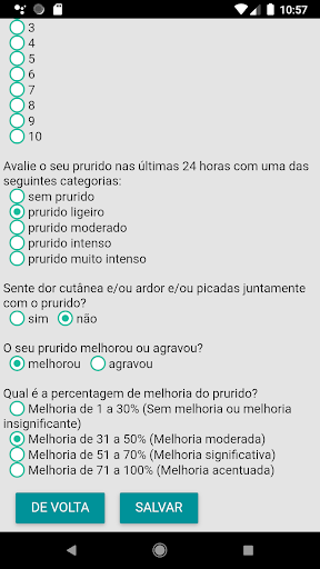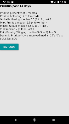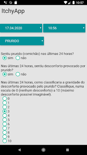 Pacientes com coceira crônica (prurido) podem documentar seus sintomas com este aplicativo. O questionário foi desenvolvido por uma equipe européia de especialistas. Se você responder a essas perguntas regularmente, o aplicativo poderá fornecer um resumo de seus sintomas para o seu médico. Seus dados podem ser transferidos com um código de barras.