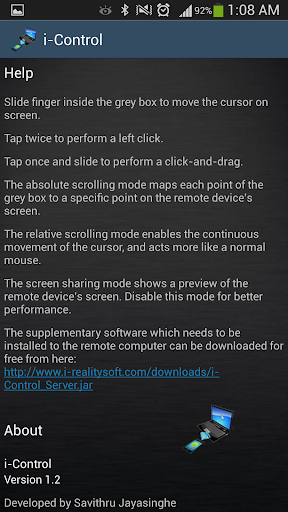 An application that converts your Android device into a Bluetooth mouse. i-Control can be used to control the mouse of any remote computer via Bluetooth. The application supports left, middle and right mouse clicks as well as double-clicks and click-and-drag operations. i-Control can also show a live preview of the remote device's screen.