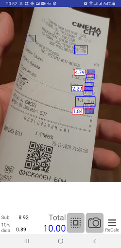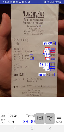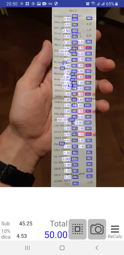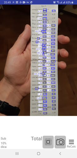 ReCalc (Calculadora de recibo) digitaliza o recibo e reconhece os preços para que você possa selecionar o seu.