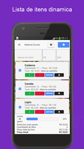 Com o Lista você pode como por exemplo criar uma listas de compras do supermercado no conforto da sua casa sem precisar de papel e caneta, posteriormente você também pode editar essa lista como incluir ou remover itens, já no mercado você pode ir colocando os preços nos itens ao adicionar no carrinho, assim você terá um controle melhor do quanto você está gastando.