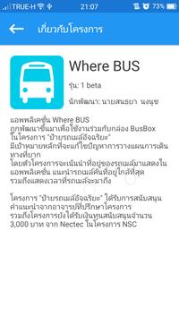 แอพพลิเคชั่น Where BUS ให้บริการแสดงที่อยู่รถโดยสารประจำทางบนแผนที่ คำนวนเวลาที่จะมาถึง แนะนำรถโดยสาร คำนวณเวลาที่จะมาถึง แสดงเส้นทางจากจุดขึ้น ไปยังจุดลงอย่างแม่นยำ