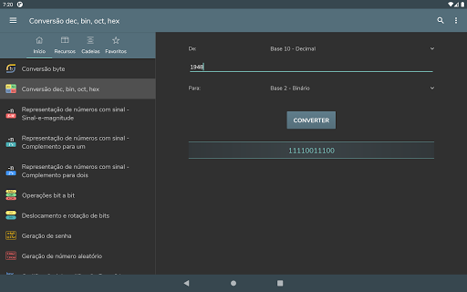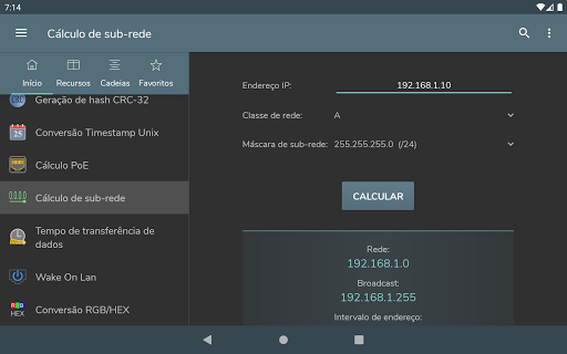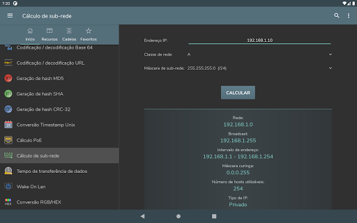 Conversão byte - Conversão dec, bin, oct, hex - Representação de números com sinal: Sinal-e-magnitude, Complemento para um, Complemento para dois - Operações bit a bit - Deslocamento e rotação de bits - Geração de senha - Geração de número aleatório - Codificação / decodificação Base 64 - Codificação / decodificação URL - Geração de hash MD5, SHA, CRC-32 - Conversão Timestamp Unix - Cálculo PoE - Cálculo de sub-rede - Tempo de transferência de dados - Wake On Lan - Conversão RGB/HEX
