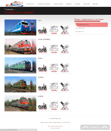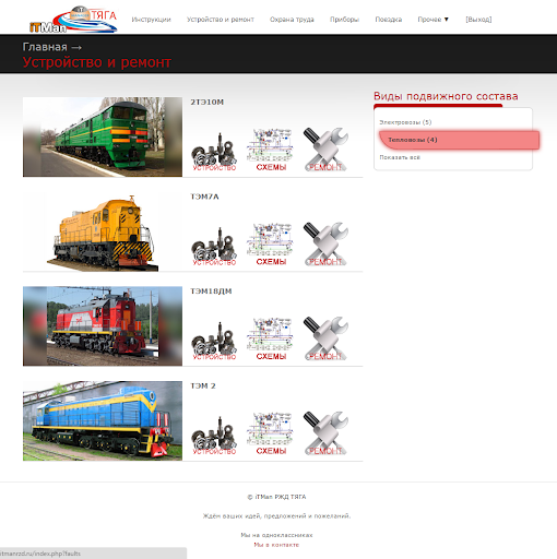 • Устройство, ремонт и схемы подвижного состава (ЭС5К (ЕРМАК), ЭП1, ВЛ85, ВЛ80Р, ВЛ80С, 2ТЭ10М, ТЭМ7А, ТЭМ18ДМ, ТЭМ 2).