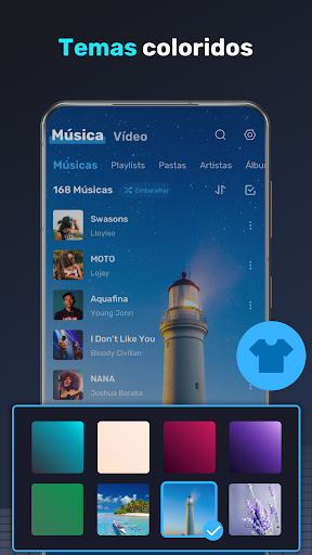 Crie um reprodutor de música colorido: vários temas de aplicativos são fornecidos por este reprodutor de áudio, você também pode usar sua própria foto como plano de fundo personalizado.