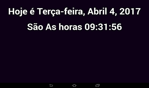 A App mostra na tela a data atual, hora e dia da semana.