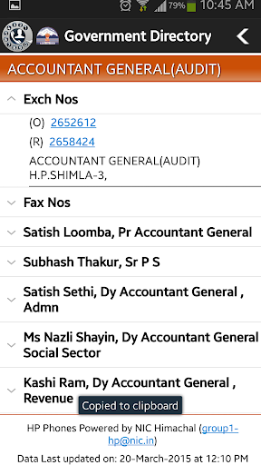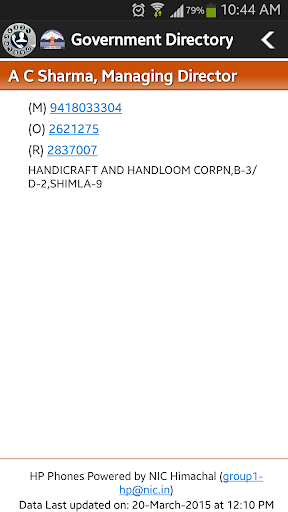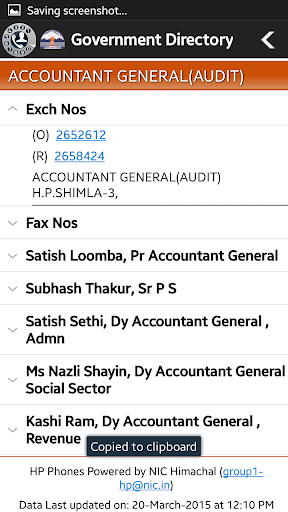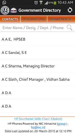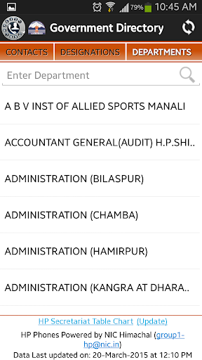 O aplicativo HP Phones contém cerca de 8000 números de telefone de funcionários do governo em Himachal Pradesh.O aplicativo fornece recursos para pesquisar qualquer número usando pesquisa de texto / número gratuito no nome, designação e departamento.A busca sábia de designação e departamento também está disponível.A pesquisa inversa de um número de telefone é inserindo qualquer número.O número selecionado dos funcionários pode ser discado diretamente pelo discador do dispositivo móvel do usuário.