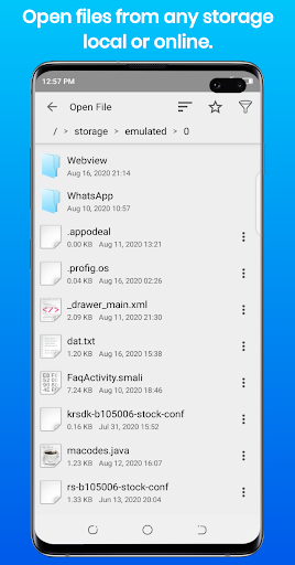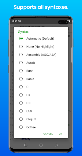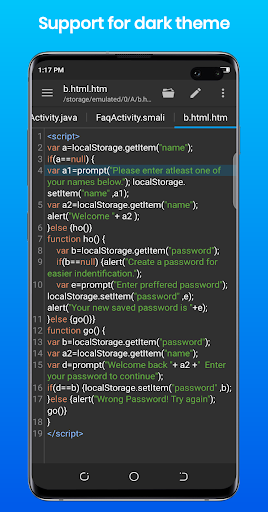 ✓Code editor and syntax highlight for 50 languages (C , C#, Java, XML, Javascript, Markdown, PHP, Perl, Python, Ruby, Smali, Swift, Kotlin, HTML,etc).
