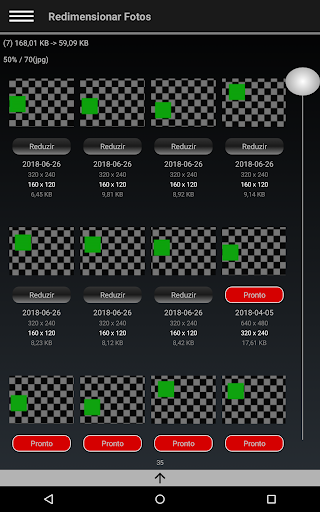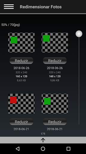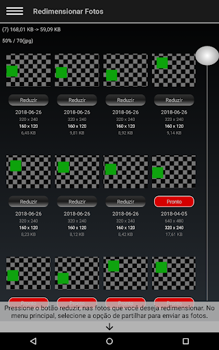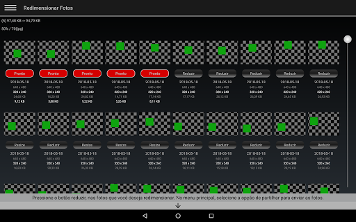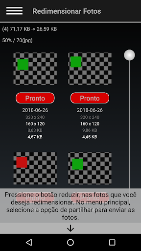 Uma maneira simples e rápida de reduzir o tamanho de um grupo de fotos antes de as partilhar. Economize em dados móveis, tempo de envio e espaço em disco. Basta pressionar o botão associado a cada foto na lista deste aplicativo, no menu hambúrguer escolha a opção para partilhar, escolha o aplicativo através do qual você deseja enviar as fotos, e é tudo.
