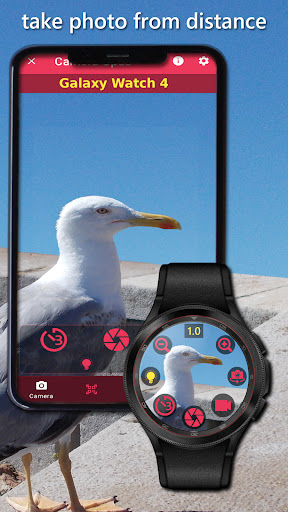2) Tire uma selfie com amigos usando apenas smartwatch para acionar o botão da câmera a partir da distância.Usando o smartwatch em um pulso e telefone no quarto do bebê.Permissão da câmera: para controlar a câmera do telefone.