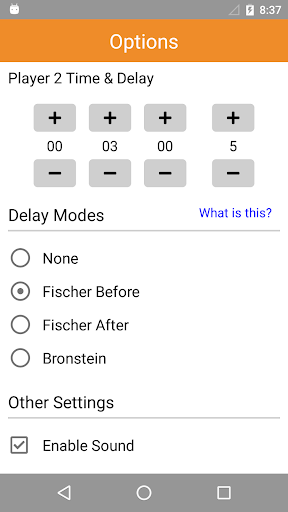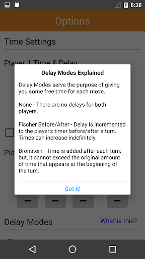 - Fischer Before/After: Delay is incremented to the player's timer before/after a turn. Times can increase indefinitely
