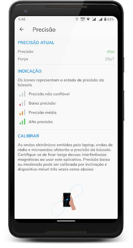 Accuracy A precisão da bússola interferirá quando o dispositivo estiver próximo de qualquer outra interferência magnética. Fique longe de objetos magnéticos, como outro dispositivo eletrônico, bateria, ímã, etc. enquanto estiver usando o aplicativo da bússola. Se a precisão não for confiável, calibre o dispositivo invertendo e movendo o telefone simultaneamente para trás e para frente nos padrões 8 (como a captura de tela mostrada).