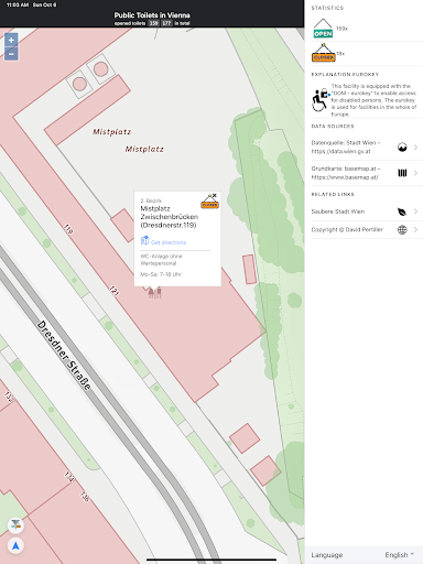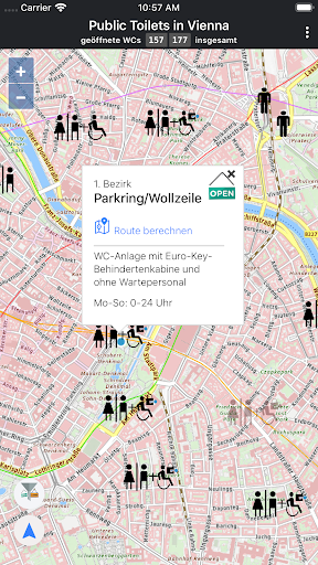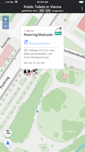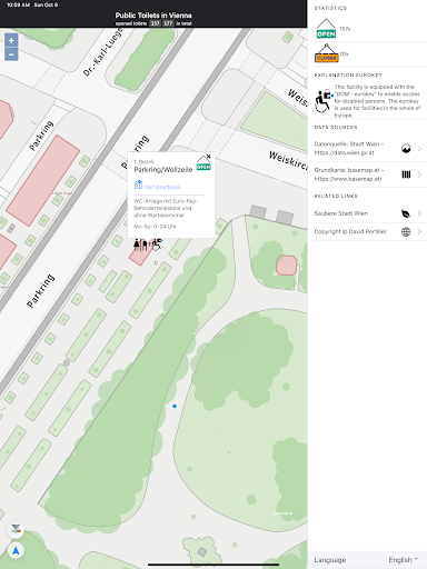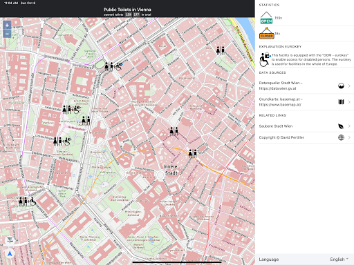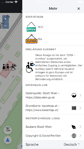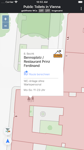 O aplicativo mostra um mapa com todos os banheiros públicos ao seu redor. O material do mapa mostra Viena não apenas nos mínimos detalhes, mas também protege sua privacidade (sem armazenamento de dados e sem rastreamento).