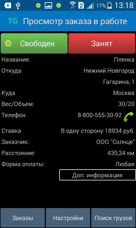 Данное мобильное приложение разработано для зарегистрированных водителей грузового транспорта для работы в онлайн-сервисе TG.RU.