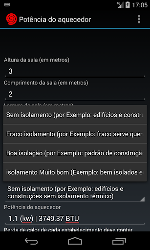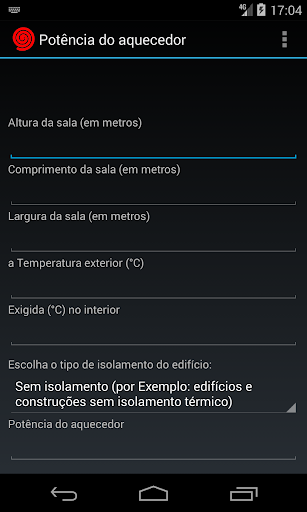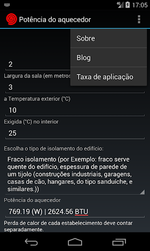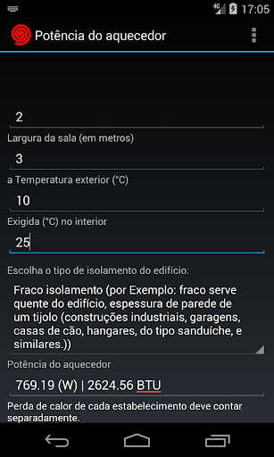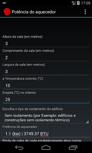 Aplicativo vai ajudar a calcular a potência do aquecedor, necessária para o aquecimento de espaços, tendo em conta desejada da diferença de temperatura através da fórmula: V x T x k = kcal/h, onde: