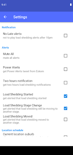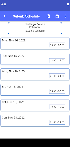 Fornece alertas e cronogramas de derramamento de carga para áreas onde a energia é fornecida pela Eskom e pelos municípios, com lembretes de quando o derramamento de carga será implementado e os tweets de alerta de energia da ESKOM, este é o seu aplicativo para o lançamento de carga.Com 36150 subúrbios cobertos e mais adicionados todos os dias.