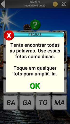Atenção!!! Atualização de versão 1.0.5 para a versão 1.0.6 levará à perda de um jogo de progresso!!!! Na versão 1.0.6 nós adicionamos prêmios por ver anúncios, reescreveu a lógica do jogo e a atualização do seu cronograma.Neste jogo apresenta 620 palavras e o mesmo tanto de imagens. Você terá de adivinhar a palavra mostrada na imagem. Principalmente as palavras utilizadas no cotidiano, mas também há os que são extremamente raros no diário de conversa. Sua tarefa é adivinhar a palavra mostrada na imagem. O jogo promove o desenvolvimento do raciocínio lógico. Desfrute das suas férias.