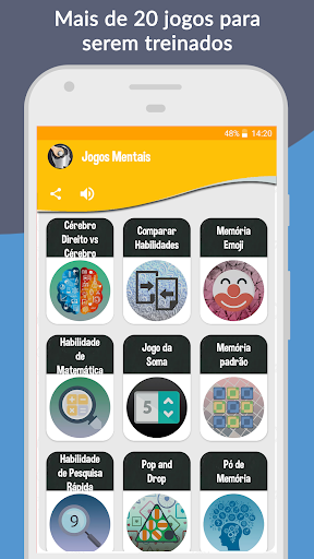 Tem 14 tipos de jogos para cumprir todo o seu exercício mental. Cada jogo tem 15 níveis e a complexidade aumentará cada nível.